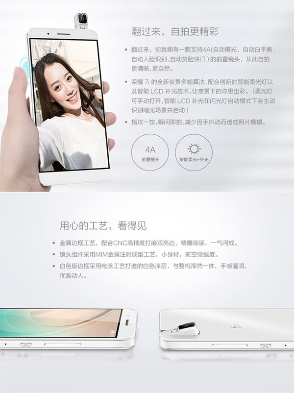 荣耀7i配备5.2寸1080屏幕,内置高通骁龙616八核64位处理器,存储方面采用2GB/3GB 内存+32GB/64GB机身存储,摄像头方面使用了一枚1300万像素索尼背照式可翻转镜头,f/2.0光圈与28mm广角保证拍摄照片的品质,官方称这枚可翻转镜头可翻转超过100000次。