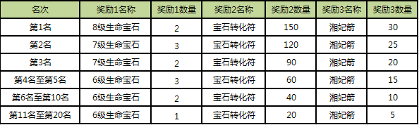 第一名:8级生命宝石*2、宝石转化符*150、湘妃剑箭*30.