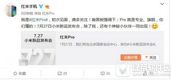 小米此前已经宣布将于7月27日举行新品发布会,此前猜测新品可能是红米note4,现在小米官方揭晓了新品的名称—红米pro。