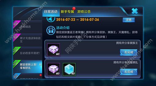 拥有并分享皮肤:美猴王,天魔缭乱,获得钻石和铭文碎片奖励。