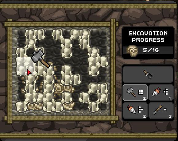 考古首先需要用刷子刷掉泥土,然后用各种工具敲掉石头。需要注意的是敲石头的工具右边的方块是工具的范围,如果范围内敲到了骨头,这次考古就失败了;数字是工具可以使用的次数,当所有工具次数用完之后你的考古也会失败